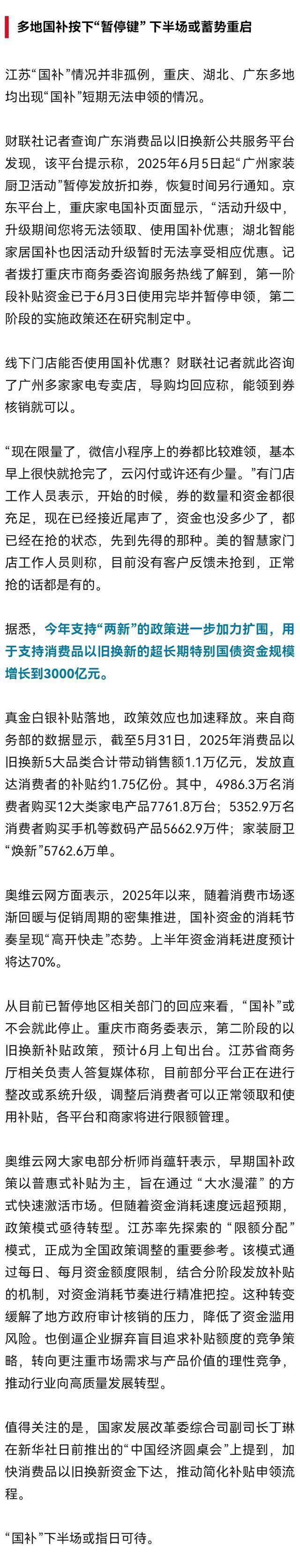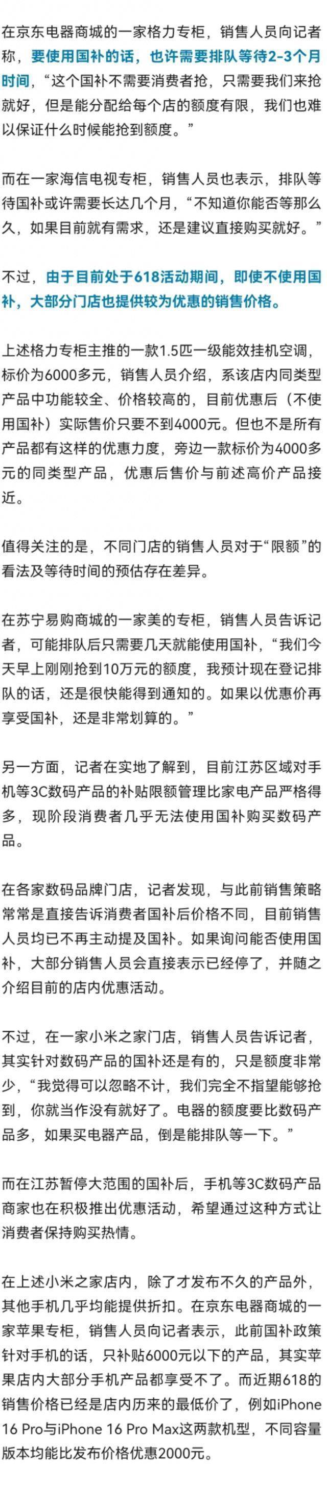 线下方面,财联社记者走访江苏南京的多家大型电子电器商城与品牌门店,了解到大范围的针对家电、3C数码产品的国家补贴均已经从6月1日开始暂停,但并非完全停止,而是采用“限额”的管理形式。对于是否以及何时有新一轮的大范围国补,受访商家均表示不了解或者没接到通知。